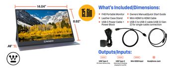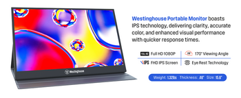 The Westinghouse 15.6-inch Full HD Portable Monitor is the ideal display for on-the-go professionals and digital nomads. This monitor is built with an IPS panel that delivers superior visual clarity with its higher color accuracy, color and brightness screen uniformity, as well as wider viewing angles. Its slim and compact design makes it ideal for business trips and general travel setups.