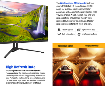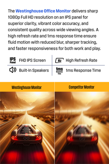 Upgrade your setup with the Westinghouse 22” Computer Monitor, built for both home office productivity and smooth gaming performance. The 1080p Full HD IPS display delivers sharp detail, vivid color, and wide viewing angles perfect for work, streaming, or entertainment. With a 100Hz refresh rate and 1ms response time, you’ll enjoy ultra-smooth visuals that reduce motion blur and input lag for seamless gameplay. Adaptive Sync technology eliminates screen tearing and stuttering, ensuring a fluid experience whether you’re working or gaming. Built-in speakers provide convenient audio without extra clutter, while versatile input options – including HDMI and VGA – make it easy to connect laptops, desktops, and gaming consoles. An HDMI cable is included for instant plug-and-play setup.