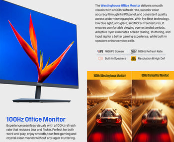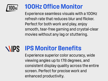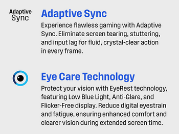 Enjoy stunning visuals with our 22-inch Full HD IPS monitor, offering 1080p resolution and accurate color reproduction. The 100Hz refresh rate ensures ultra-smooth motion clarity, ideal for gaming and fast-paced content, while Adaptive Sync minimizes screen tearing and input lag. Built-in speakers provide clear audio, and EyeRest Technology reduces eye strain with flicker-free, anti-glare, and low-blue light settings. This monitor is HDMI and VGA compatible, making it easy to connect both modern and legacy devices. HDMI cable included.