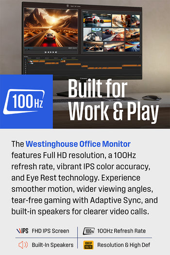 Enjoy stunning visuals with our 22-inch Full HD IPS monitor, offering 1080p resolution and accurate color reproduction. The 100Hz refresh rate ensures ultra-smooth motion clarity, ideal for gaming and fast-paced content, while Adaptive Sync minimizes screen tearing and input lag. Built-in speakers provide clear audio, and EyeRest Technology reduces eye strain with flicker-free, anti-glare, and low-blue light settings. This monitor is HDMI and VGA compatible, making it easy to connect both modern and legacy devices. HDMI cable included.