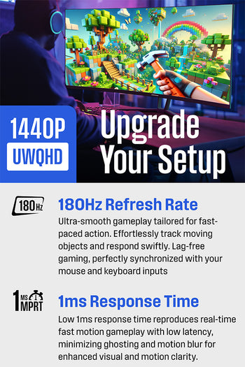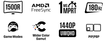 The 34-inch curved monitor has a 3440 x 1440 resolution for enhanced image sharpness, increased desktop real estate, and a wider field of view for an immersive viewing experience. It's built with a VA panel that delivers stunning high-contrast visuals and deeper blacks for enhanced visual depth. The 1500R screen curve wraps around your field of view and helps reduce glare and edge distortion, creating a more uniform viewing distance, and further enhancing the gaming and movie-watching experience. Equipped with a high native refresh rate of 180Hz, this PC gaming monitor delivers seamless fast-motion action and fluid onscreen visuals, making it an ideal choice for competitive multiplayer FPS games. The low 1ms response time works to minimize ghosting and motion blur for enhanced visual and motion clarity when playing fast-paced games. Our curved monitor is powered by AMD FreeSync technology to help minimize stuttering, screen tearing, and input lag for smoother and more responsive gameplay.