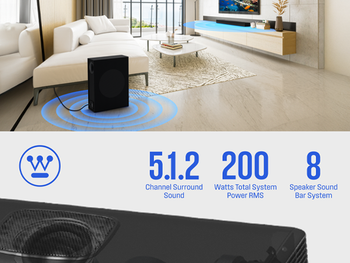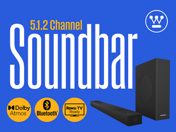 Elevate your home entertainment system with the Westinghouse 5.1.2 Channel 200 Watt Soundbar. With Dolby Atmos Up-Firing Height and Side-Surround Speakers, you'll experience immersive, three-dimensional audio that makes it feel like sounds are all around you. The wireless subwoofer can be placed anywhere for deep, impactful bass without the clutter of cables. It's Roku TV Ready™, so setup is a breeze and you can control everything with your Roku® remote. Plus, with Bluetooth streaming and multiple connectivity options, you can easily connect and enjoy all your favorite content.