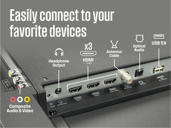 Connectivity is King – A full array of inputs to connect your cable box, game console, streaming stick, sound bar, DVD/Blu-ray player or a digital antenna for local channels. Packed with 4 x HDMI, 1 x Composite Video, 1 x Optical Digital inputs for maximum flexibility.